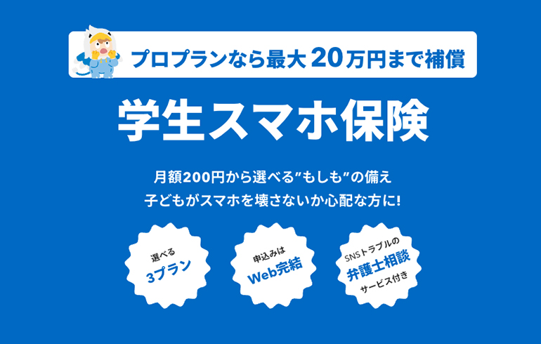 学生向けの格安SIM/SIMなし端末専用の保険です。スマホの画面割れ、盗難などスマホのトラブルを補償する他、SNS等のトラブルにあったときに無料の法律相談サービスがご利用できます。